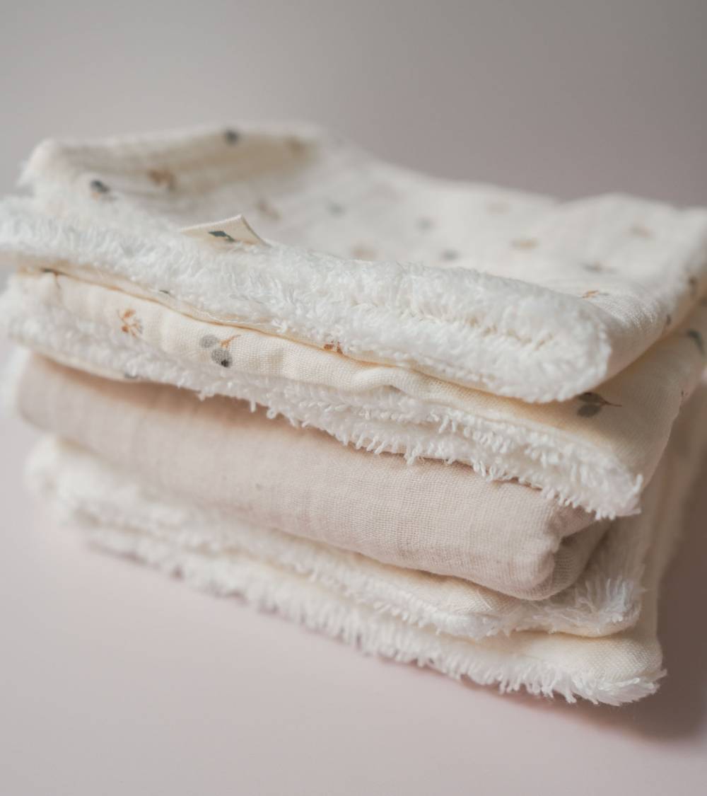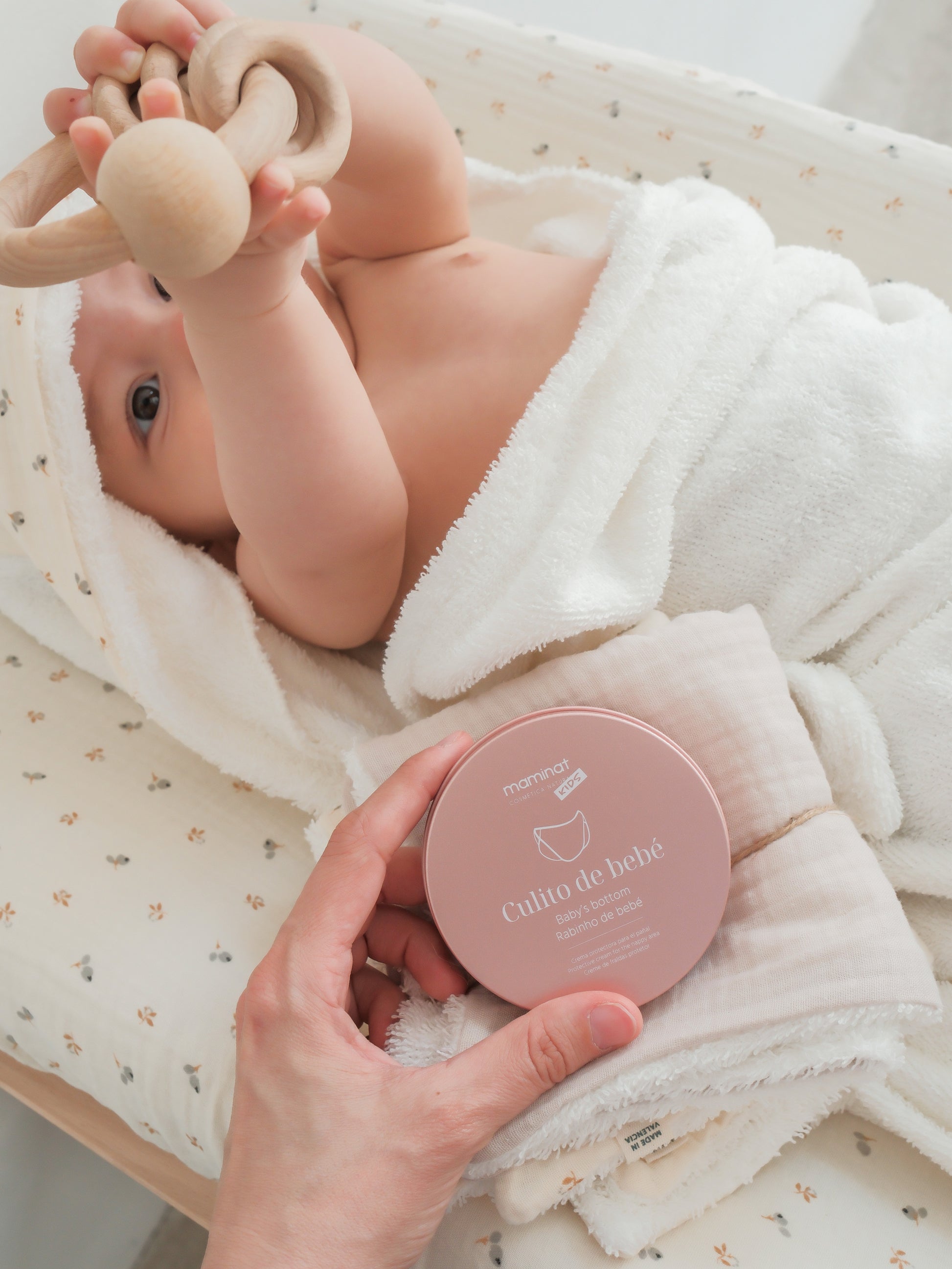 Las 3 toallas son de algodón orgánico de la marca Nonotú y verás qué suaves y “gustosas” son.Te servirán para secar el cultivo en cada cambio de pañal y así, después, poder aplicar nuestra cremita que evitará que el peque tenga rojeces en una zona tan delicada.